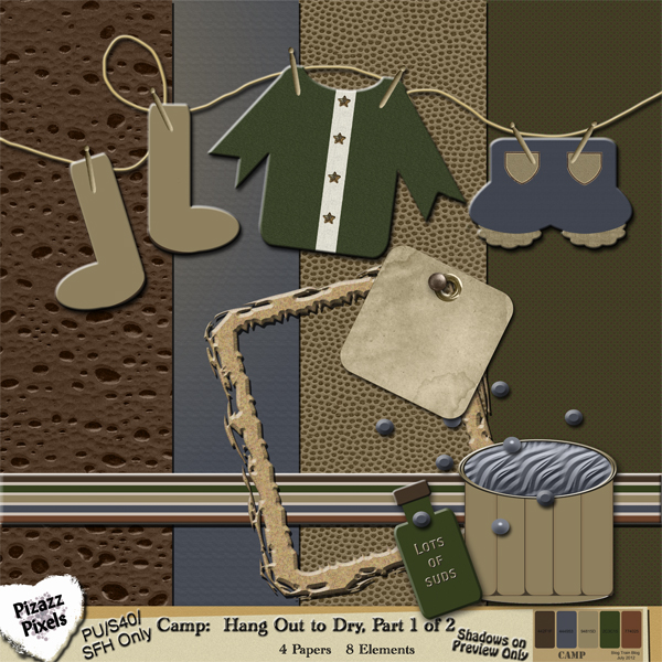 I know what you are probably waiting for--Here is a July gift just for you...It is my contribution to The July 2012 Blog Train--Camp. This kit is called Hang Out to Dry. I created it around the theme of outdoors, nature, and clothing hanging out on the line to dry in that fresh air.